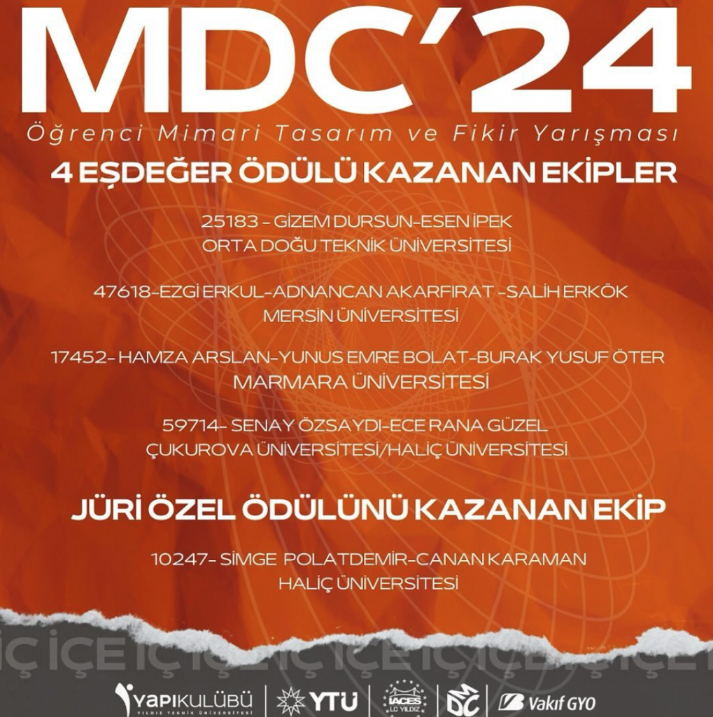 Mimarlık Fakültesi, Mimarlık Bölümü öğrencileri Ezgi Erkul, Adnancan Akarfırat ve Salih Erkök tarafından "MDC’24: İç İçe” başlıklı ulusal öğrenci mimari tasarım ve fikir yarışması için hazırlanan mimari tasarım projesi eşdeğer ödül kazandı.
