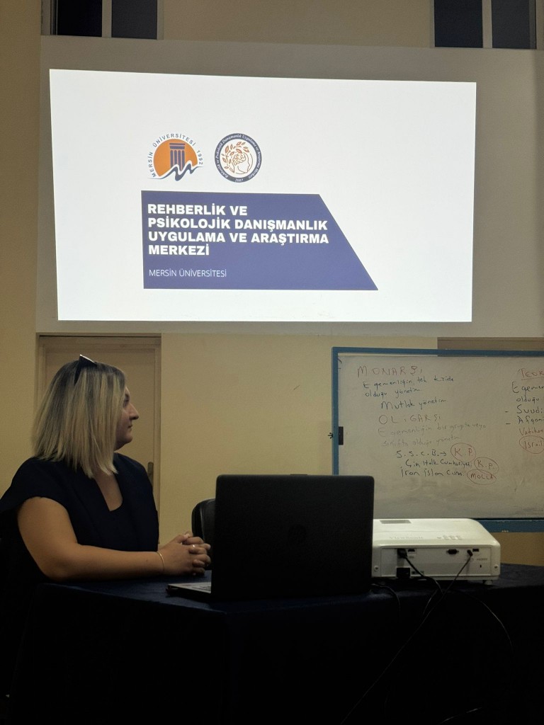 Mersin Üniversitesi Erdemli Meslek Yüksekokulu oryantasyon programı kapsamında Rehberlik ve Psikolojik Danışmanlık Uygulama ve Araştırma Merkezi’ni tanıtmak, öğrencilerimizin istek ve ihtiyaçlarını dinlemek için merkez uzmanlarımızdan Öğr. Gör. Dr. Sena Karakuş ve Öğr. Gör. Türkan Büşra Gür’ün katılımı ile 23 Eylül tarihinde Erdemli Meslek Yüksekokulu konferans salonunda seminer düzenlendi. Merkez Müdür Yardımcısı Öğr. Gör. Dr. Sena Karakuş’un merkezimizi tanıttığı seminerde merkezimiz hizmetleri, hangi durumlarda, nasıl başvurulacağı konusunda öğrenciler bilgilendirildi.