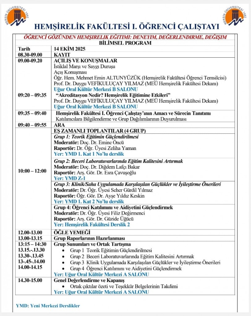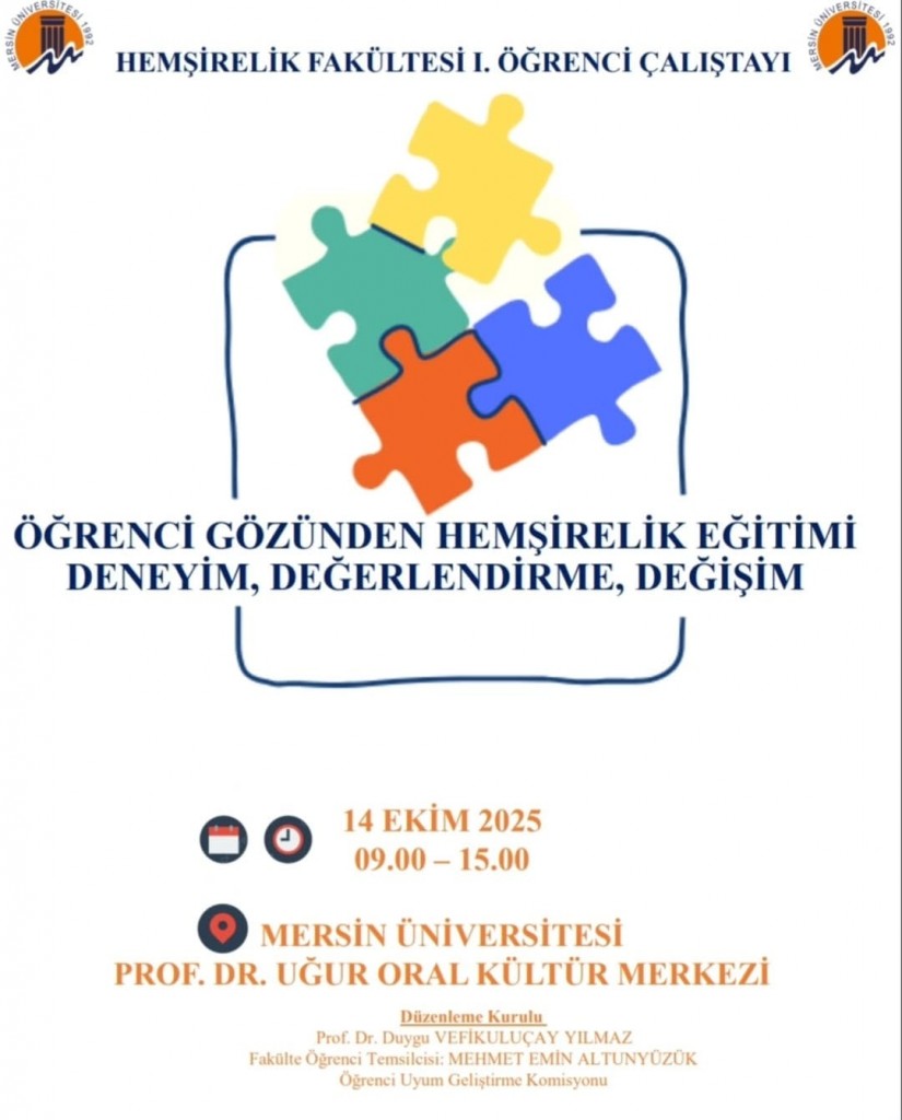 Mersin Üniversitesi Hemşirelik Fakültesi öncülüğünde ve öğrencilerimizin katkılarıyla 14 Ekim 2025 tarihinde gerçekleştirilecek olan Hemşirelik Fakültesi I. Öğrenci Çalıştayı’na tüm öğrencilerimizin katılımını bekliyoruz.