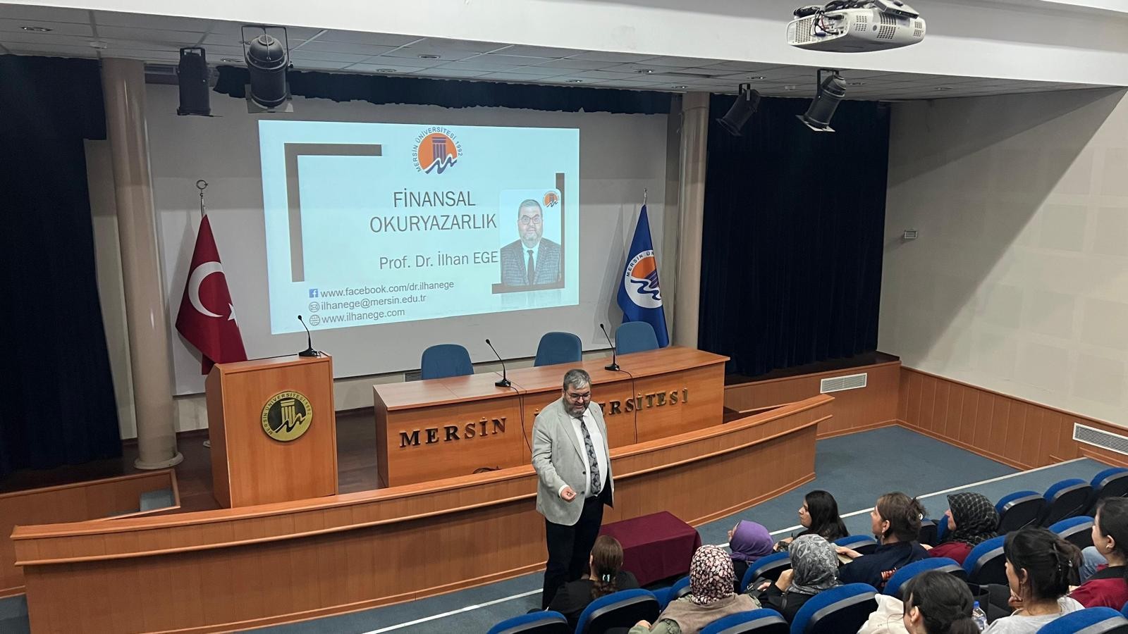 Mersin Üniversitesi Hizmet İçi Eğitim Müdürlüğü tarafından düzenlenen “Finansal Okuryazarlık Eğitimi”, Kariyer Merkezi Müdürü Prof. Dr. İlhan Ege tarafından gerçekleştirildi. Eğitime, üniversitemizde İŞKUR İşbaşı Eğitim Programı kapsamında görev yapan personeller katılım sağladı. Prof. Dr. Ege, eğitimde finansal okuryazarlığın bireylerin hem kişisel hem de profesyonel yaşamlarında bilinçli kararlar alabilmeleri açısından önemine vurgu yaptı. Katılımcılara bütçe yönetimi, tasarruf, yatırım araçları, gelir-gider dengesi ve finansal risk yönetimi gibi konularda bilgi ve örnekler aktarıldı. Eğitim, soru-cevap bölümüyle tamamlanırken, katılımcılar finansal farkındalıklarını artırma fırsatı buldu.