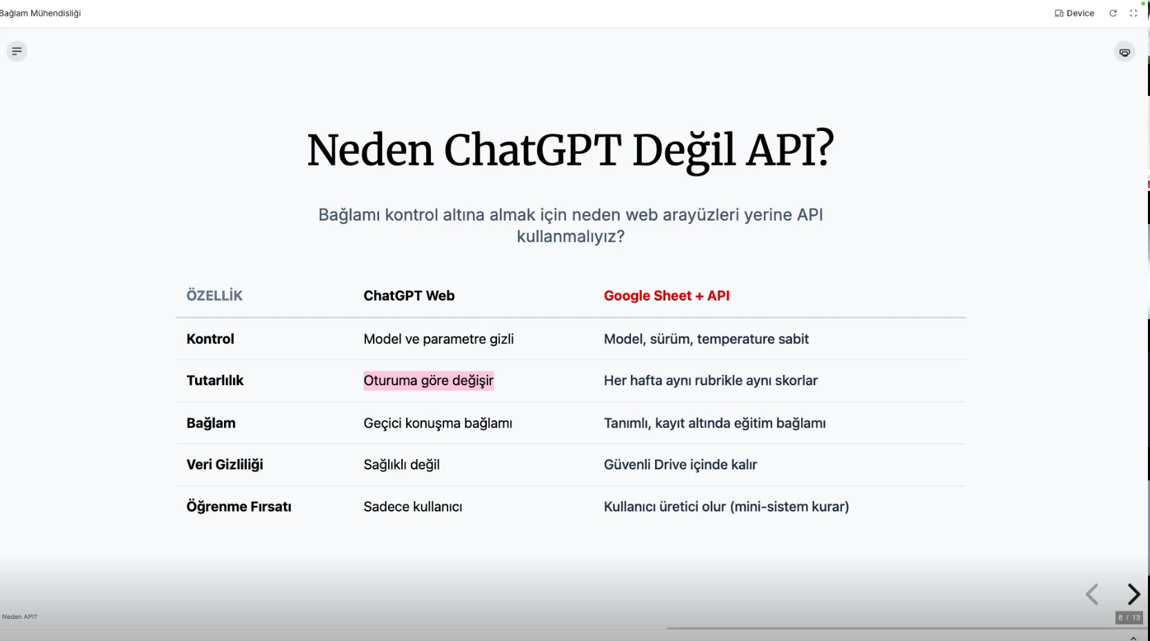 Etkinlikte, eğitimcinin değişen rolleri, bağlam mühendisliği yaklaşımı, açık uçlu yanıt değerlendirme yöntemleri ve Uygulama Programlama Arabirimi (API - Application Programming Interface) konularında kapsamlı bilgiler paylaşıldı. Ayrıca, yapay zekâ araçlarının eğitim ortamlarında nasıl etkili biçimde kullanılabileceğine ilişkin örnek uygulamalara yer verildi.