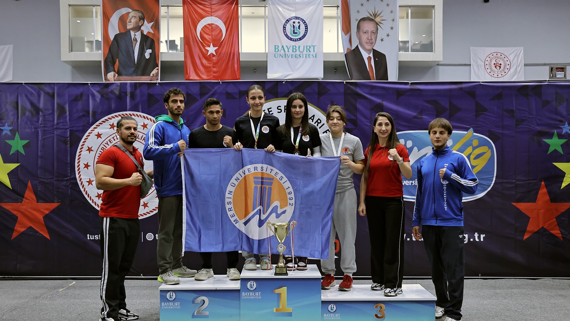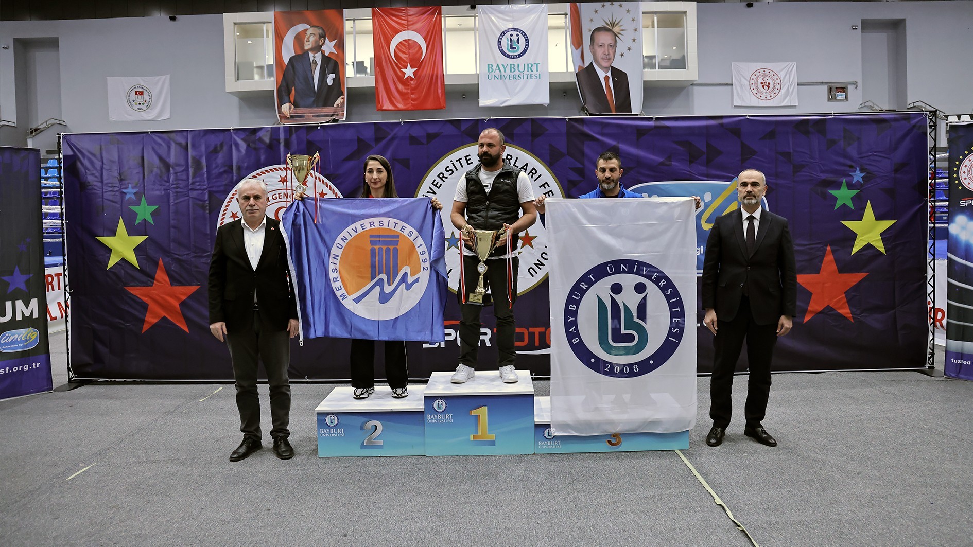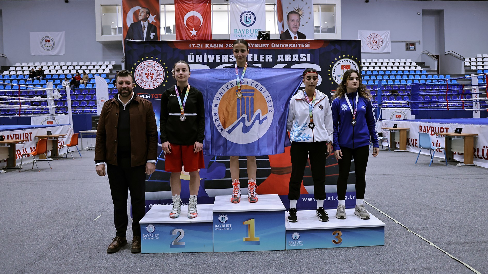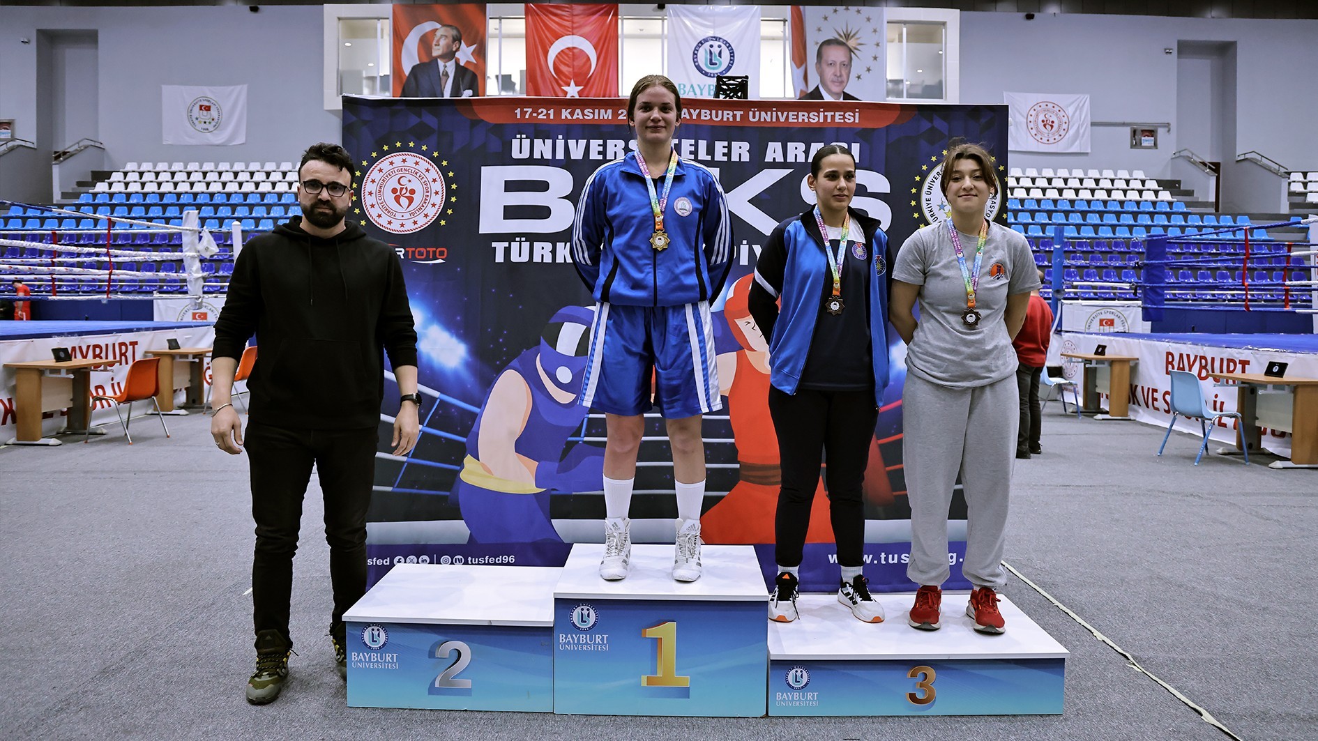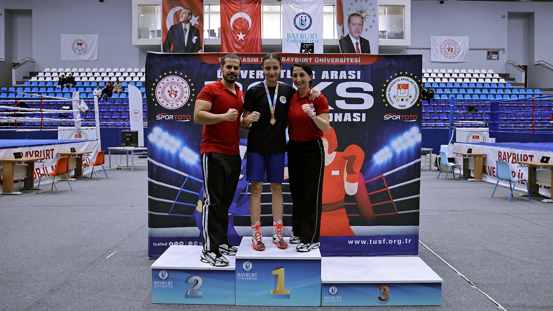 TÜSF tarafından organize edilen ve Bayburt Üniversitesi’nin ev sahipliğinde yapılan Türkiye Üniversitelerarası Boks Şampiyonası, 17-21 Kasım tarihleri arasında 43 üniversiteden 170 sporcunun katılımıyla gerçekleştirildi. Üniversitemizi 3 kadın, 3 erkek olmak üzere toplam 6 sporcu ve 1 antrenör temsil etti. Müsabakalar sonucu sporcularımız 1 altın ve 2 bronz madalya kazandı. Ayrıca kadın takımımız maçlardaki başarılarından dolayı topladıkları puan ile genel klasmanda 2. olarak kupa kazandı. Takım antrenörü Gizem Akarsu Taşman ve sporcularımız, kendilerine desteğini esirgemeyen Rektörümüz Prof. Dr. Erol Yaşar başta olmak üzere ve emeği geçen herkese teşekkür etti.