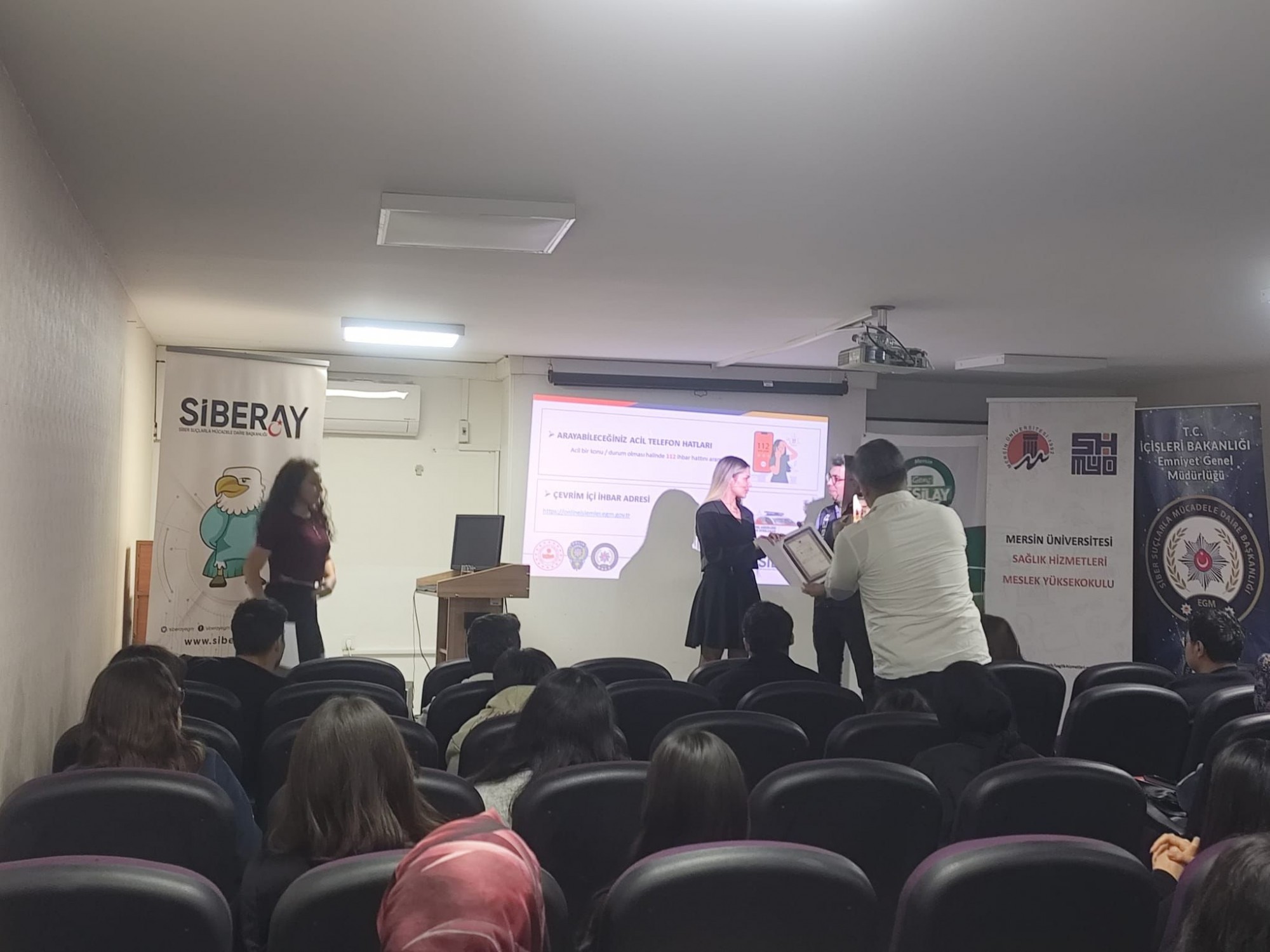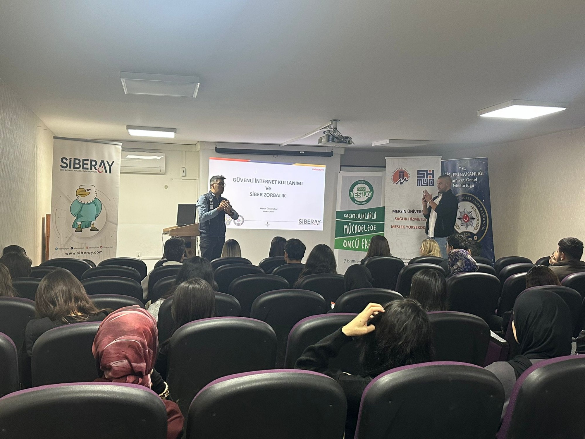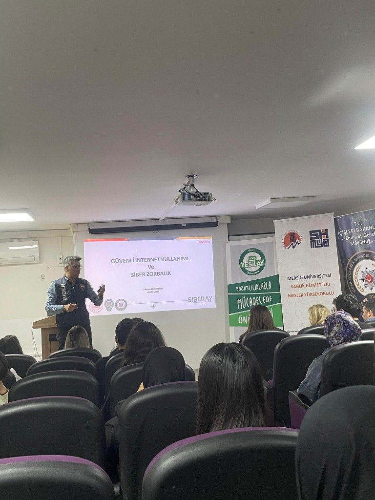 Meslek Yüksekokulumuz ev sahipliğinde; Genç Yeşilay Topluluğu ve Mersin İl Emniyet Müdürlüğü Siber Suçlarla Mücadele Şube Müdürlüğü iş birliğiyle “Güvenli İnternet Kullanımı ve Siber Zorbalıkla Mücadele” Konferansı, 12 Aralık 2025 tarihinde Sağlık Hizmetleri Meslek Yüksekokulu Konferans Salonu’nda gerçekleştirildi.