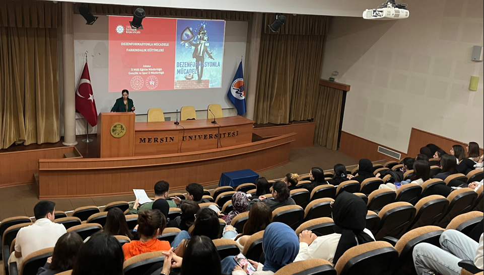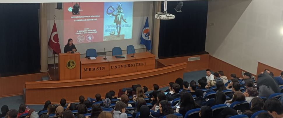 Mersin Üniversitesi Hemşirelik Fakültesi öğrencilerine, T.C. Cumhurbaşkanlığı İletişim Başkanlığı tarafından hazırlanan "Dezenformasyonla Mücadele Farkındalık Eğitimleri" verildi. Eğitim, 02-03 Aralık 2025 tarihlerinde Prof. Dr. Uğur Oral Kültür Merkezi’nde Dr. Öğr. Üyesi Esra ÇAVUŞOĞLU tarafından gerçekleştirildi. Programda dezenformasyonun tanımı, türleri, örnekleri ve dezenformasyonla mücadele yolları ayrıntılı biçimde ele alındı. Video sunumlarıyla desteklenen etkinlik sonunda öğrencilerin soruları yanıtlandı. Eğitim sonunda öğrencilerin dezenformasyon kavramına ilişkin eksik bilgileri tamamlanarak doğru bilgiler pekiştirildi. Katılımcılar, dezenformasyonla mücadelede daha bilinçli hale gelirken, etkinlik verimli ve öğretici bir şekilde tamamlandı.