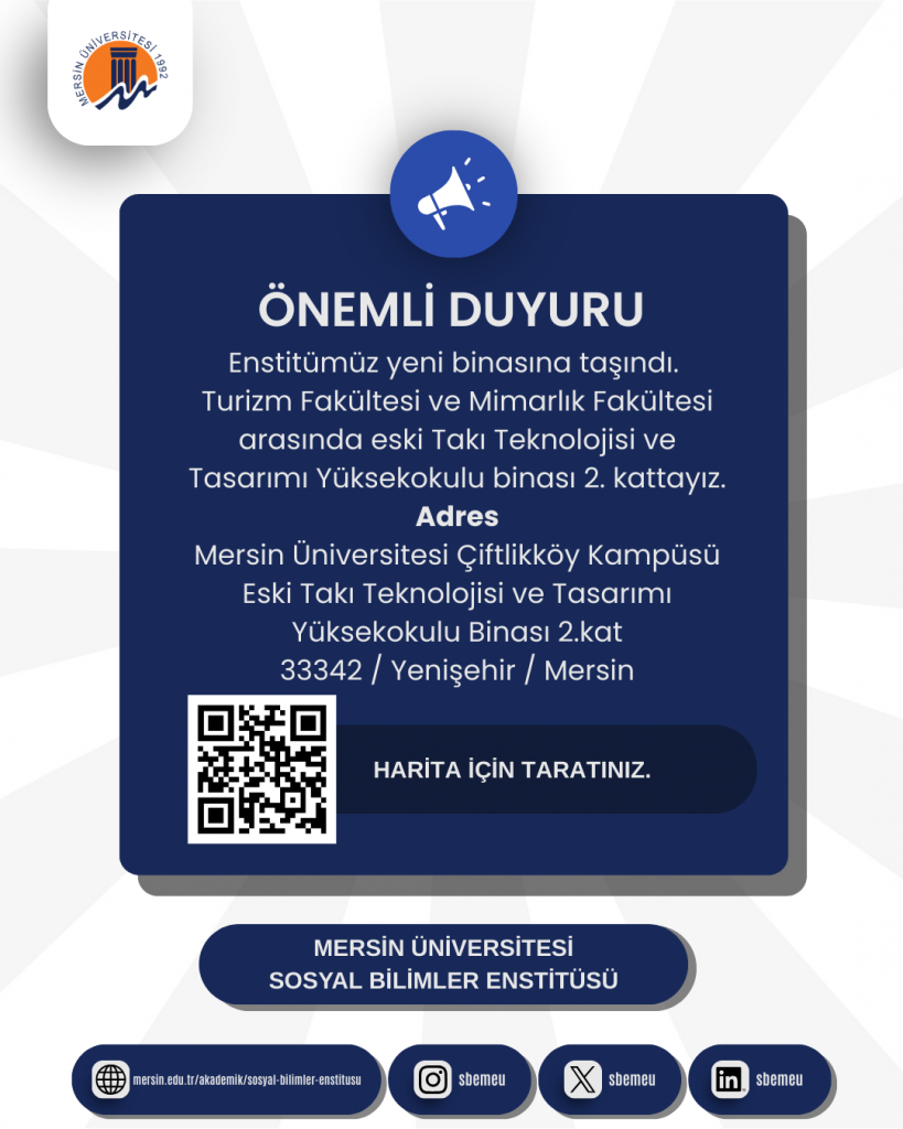 Sosyal Bilimler Enstitüsü 02.01.2026 tarihi itibarıyla yeni binasına taşındı. Enstitümüz Turizm Fakültesi ile Mimarlık Fakültesi arasında bulunan eski Takı Teknolojisi ve Tasarımı Yüksekokulu Binasının 2. katında hizmet vermeye başladı.
