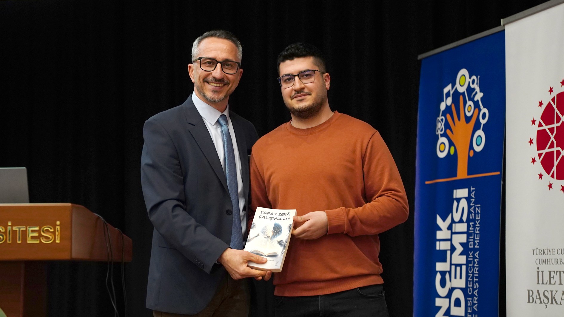 Soru- cevap kısmından sonra Üniversitemiz sosyal medya içeriklerini hazırlayan İletişim Fakültesi öğrencisi, içerik üreticisi Umut Can Şık’a “Yapay Zekâ Çalışmaları” adlı kitabı hediye etti.