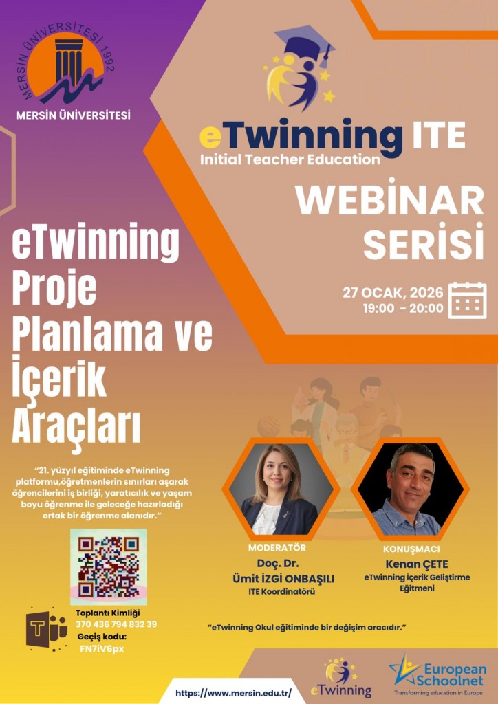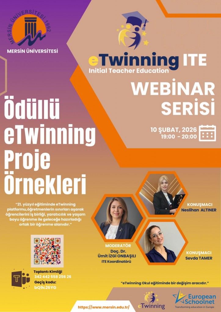 Mersin Üniversitesi Eğitim Fakültesi bünyesinde yürütülen eTwinning ITE (Initial Teacher Education) çalışmaları kapsamında, ITE Koordinatörümüz Doç. Dr. Ümit İzgi Onbaşılı moderatörlüğünde düzenlenen webinar werisi tamamlandı. Webinarlar, Dekanımız Prof. Dr. Nisa Ünaldı Coral’ın katılımıyla; fakültemiz öğretim elemanları ve çok sayıda öğrencimizin yoğun ilgisiyle gerçekleştirildi. Etkinlikler, Mersin İl Koordinatörü Bircan Keleş’in desteği ve Mersin İl Millî Eğitim Müdürlüğü iş birliğiyle yürütüldü.