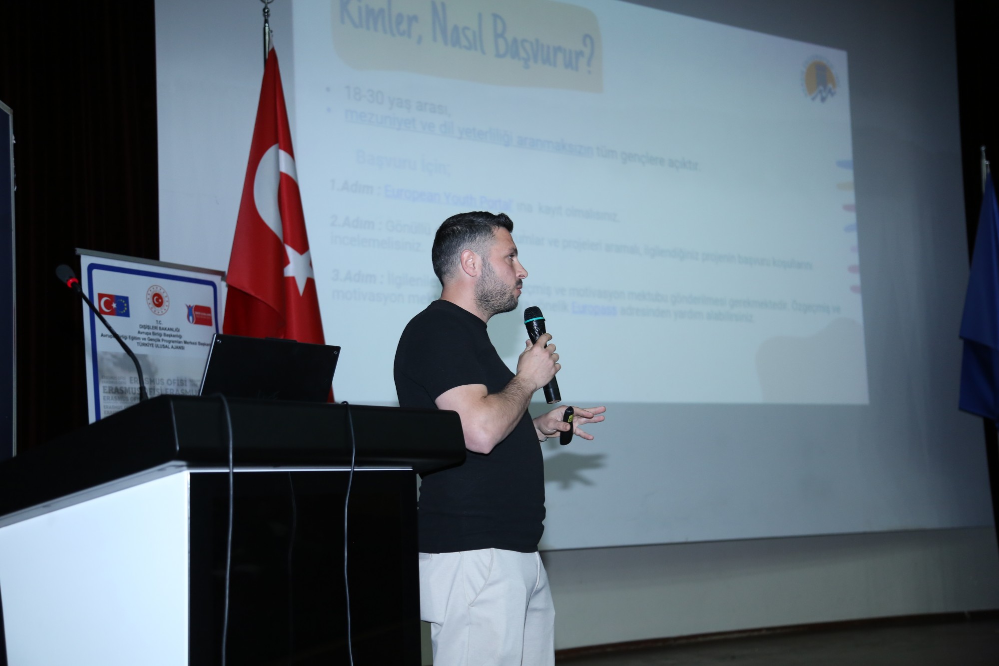 Ardından, Erasmus+ Gençlik ve Avrupa Dayanışma Programı (ESC) gönüllülük projeleri hakkında bilgilendirme yapmak üzere Ahmet Abalı söz aldı. Sunumda, Erasmus+ gençlik projelerinin kapsamı, gönüllülük fırsatları ve öğrencilerin bu projeler aracılığıyla edinebilecekleri sosyal ve kişisel kazanımlar ele alındı.