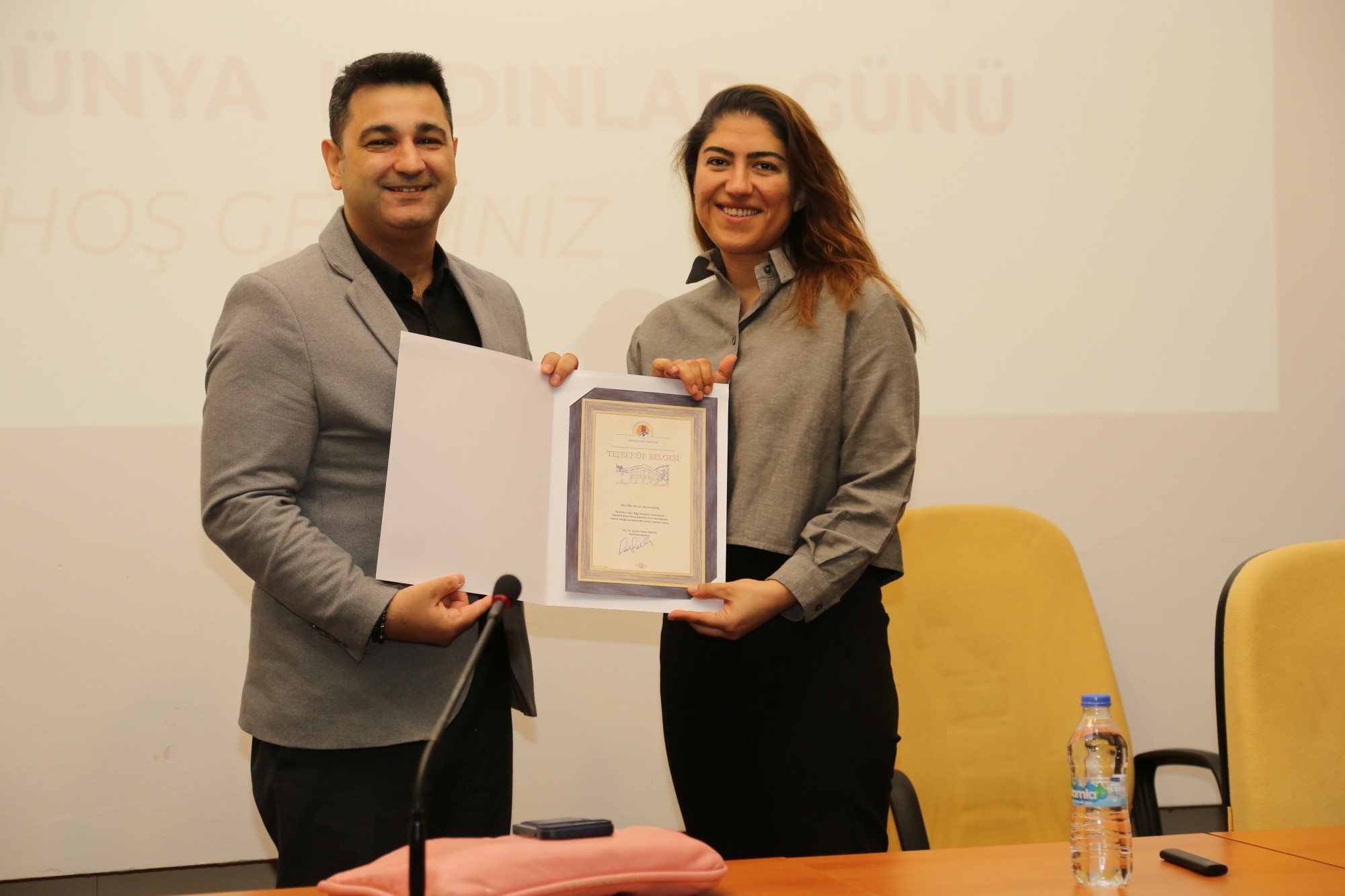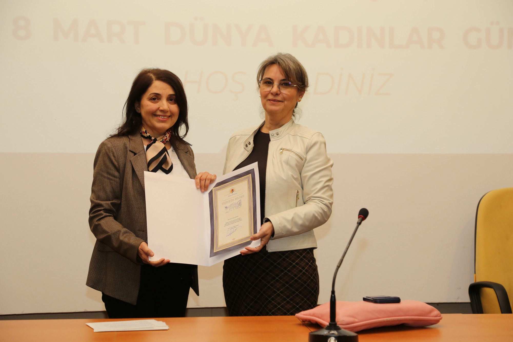 Etkinliğin sonunda Rektör Danışmanlarımızdan Prof. Dr. Tuğba Yanar tarafından Prof. Dr. Arzu Aydın Acı’ya, Rektör Danışmanlarımızdan Doç. Dr. Buğra Sarı tarafından ise Öğr. Gör. Dr. Nermin Alkan’a katkılarından dolayı teşekkür belgeleri takdim edildi.