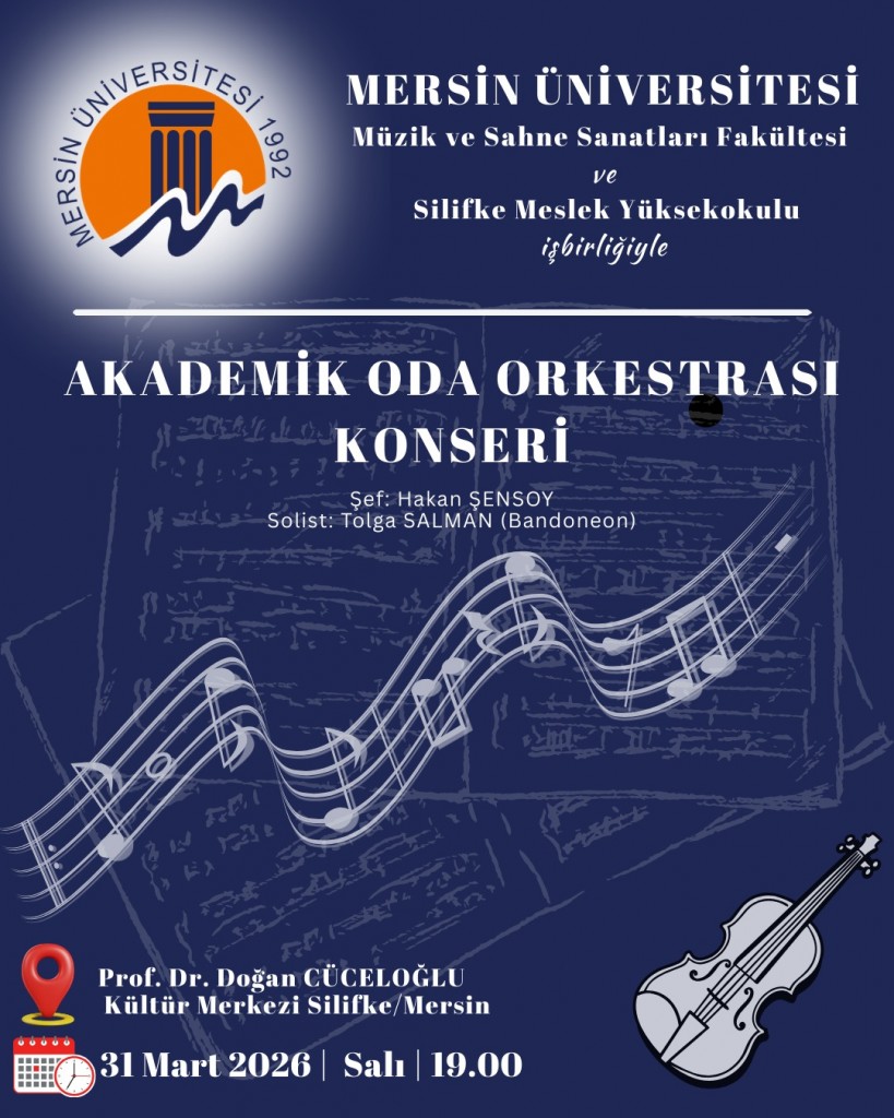 Mersin Üniversitesi Müzik ve Sahne Sanatları Fakültesi ile Silifke Meslek Yüksekokulu iş birliğinde düzenlenen Akademik Oda Orkestrası Konseri, Silifke’de sanatın büyüleyici atmosferini yeniden canlandırıyor!