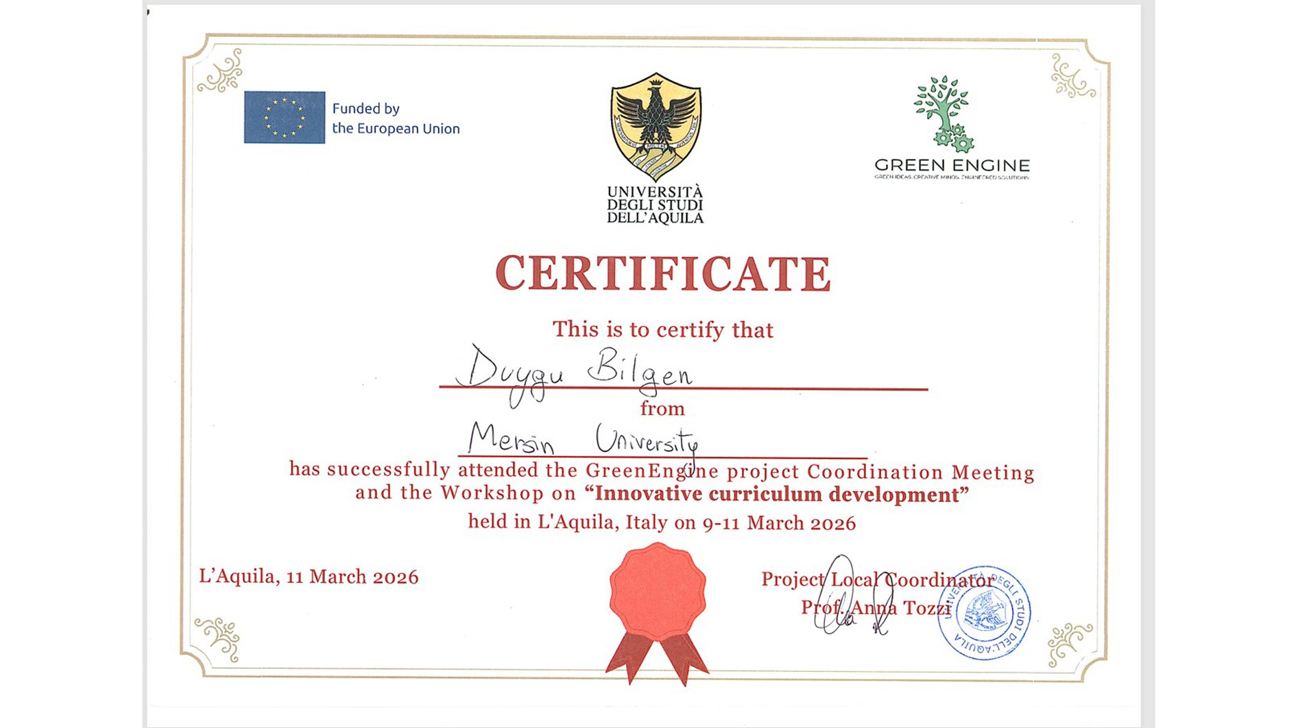 Avrupa Komisyonu tarafından Erasmus+ Yükseköğretimde Kapasite Geliştirme (CBHE) programı kapsamında desteklenen GREENENGINE (Sürdürülebilir Yeşil Bir Dünya İçin Yaratıcı Mühendislik Eğitiminin Teşviki) projesi çerçevesinde, İtalya L'Aquila Üniversitesi ev sahipliğinde uluslararası bir koordinasyon toplantısı gerçekleştirildi. Toplantıya Üniversitemizi temsilen Mühendislik Fakültesi öğretim üyelerimiz Prof. Dr. H. Duygu Bilgen ve Prof. Dr. Emre Akın katıldı.