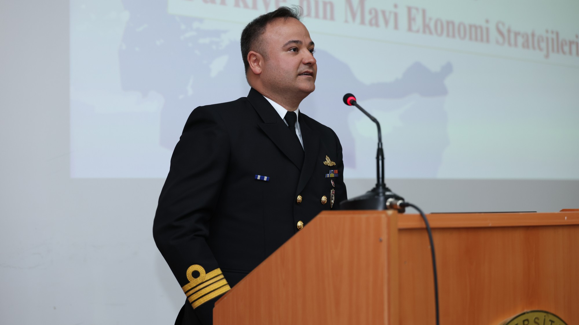 Açılış konuşmasının ardından konferans sunumuna geçildi. Dz. Yb. Serkan Karslı tarafından gerçekleştirilen kapsamlı sunumda Mavi Vatan kavramının tarihsel arka planı; Barbaros Hayreddin Paşa'nın "Denizlere hakim olan cihana hakim olur" ve Gazi Mustafa Kemal Atatürk’ün "Denizciliği Türk’ün büyük milli ülküsü olarak düşünmeli ve onu az zamanda başarmalıyız" sözleri üzerinden katılımcılara aktarıldı. Türkiye’nin deniz yetki alanlarının dış sınırlarını kapsayan Mavi Vatan stratejisinin; ana kara, su yüzeyi, su kütlesi, suyun altındaki zemin ve bunların üzerindeki hava sahasından oluştuğu belirtildi.