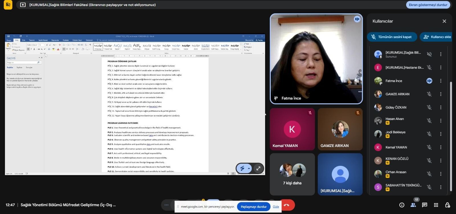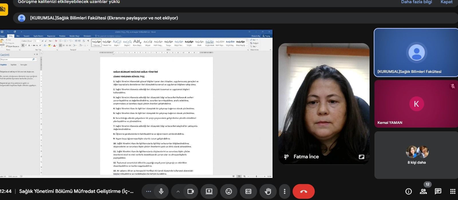 Sağlık Yönetimi Programı, eğitim kalitesini artırmaya yönelik çalışmalar kapsamında 7 Nisan 2026 tarihinde çevrim içi bir müfredat geliştirme toplantısı gerçekleştirdi. Toplantı, Sağlık Bilimleri Fakültesi Dekanı ve aynı zamanda Sağlık Yönetimi Bölüm Başkanı Prof. Dr. Fatma İnce Çırak’ın organizasyonunda düzenlendi. Toplantıya bölüm öğretim üyelerinin yanı sıra iç ve dış paydaşlar da yoğun katılım sağladı. Programın mevcut durumu, gelişim alanları ve güncel ihtiyaçlara uyumu kapsamlı şekilde ele alındı.